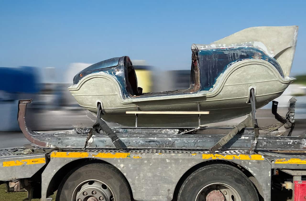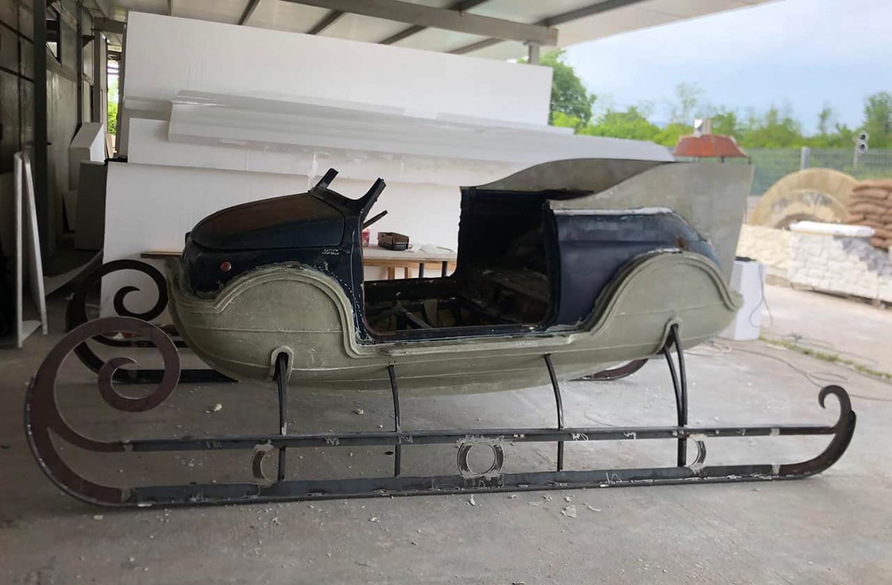 Seguendo l’idea creativa dello scenografo Federico Costantini, il nostro team ha lavorato per dare forma a un mezzo scenico completamente originale, capace di unire realismo, funzionalità e magia cinematografica. La struttura è stata realizzata in vetroresina, modellata su misura per integrarsi con il telaio dell’auto, mentre i pattini sono stati costruiti in ferro, garantendo solidità e credibilità visiva.