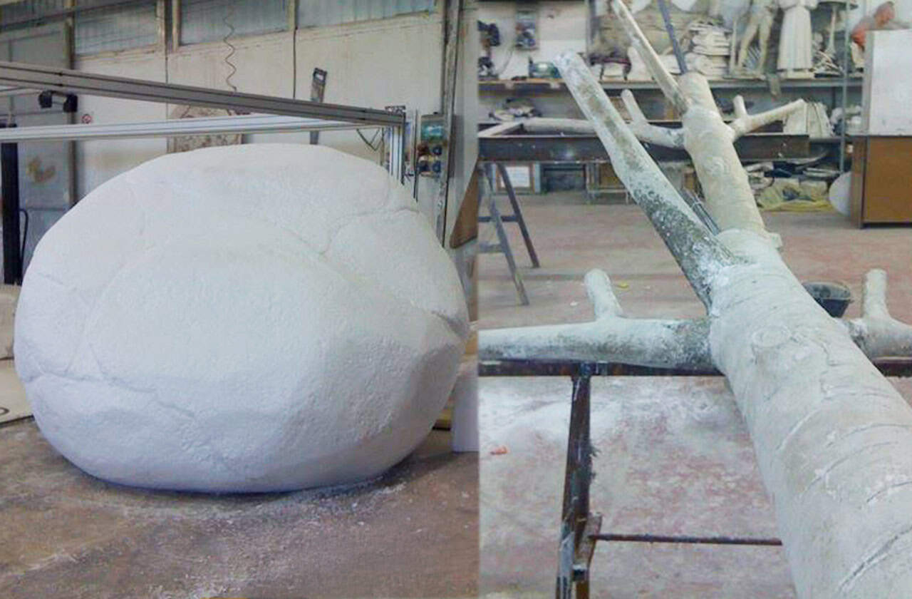 Tecnostyle ha dato forma a questo sogno con la creazione di rocce bianche, luogo d’incontro tra realtà e immaginazione, e degli alberi di sfondo, che definiscono la profondità scenografica e donano all’insieme un tono fiabesco.